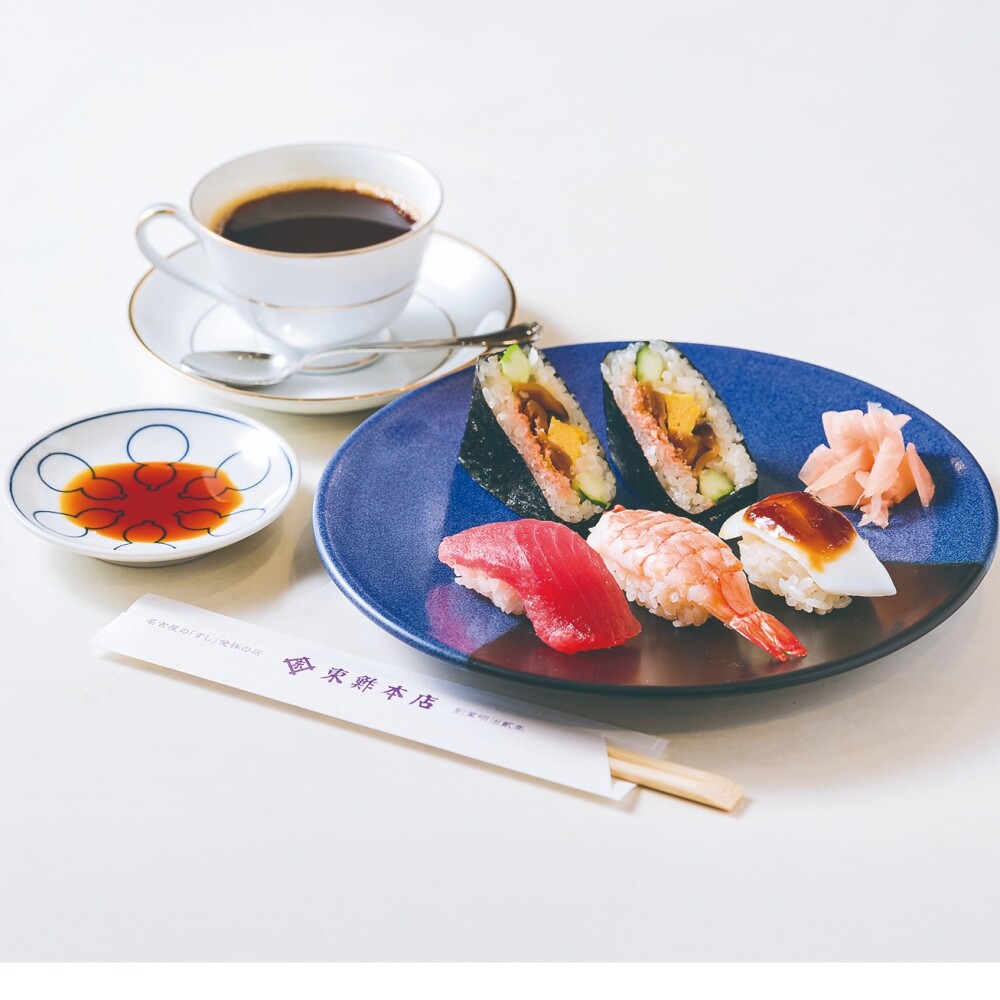 鮪1貫、海老1貫、テリイカ1貫、変わり上巻2切れ、ホットコーヒー付き